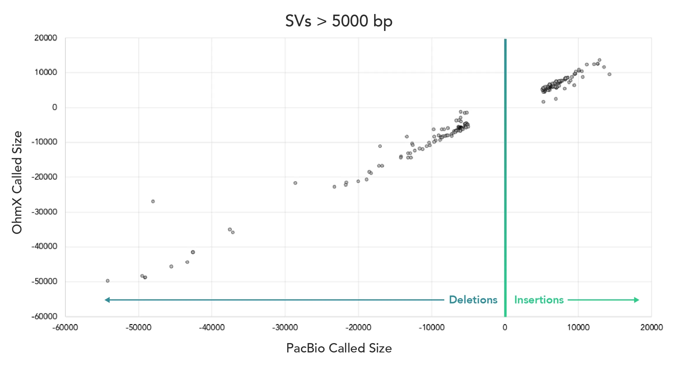 In the white paper, Electronic Genome Mapping for Confirmation of Long Structural Variants, we compare genome-wide SV calls exceeding 5 kb from EGM and PacBio HiFi in HG002. EGM data demonstrates a strong correlation to insertion and deletion calls made by PacBio HiFi. The data demonstrate EGM's precision in confirming PacBio's SV calls with nearly identical size estimates, underscoring its capability as an orthogonal validation method.