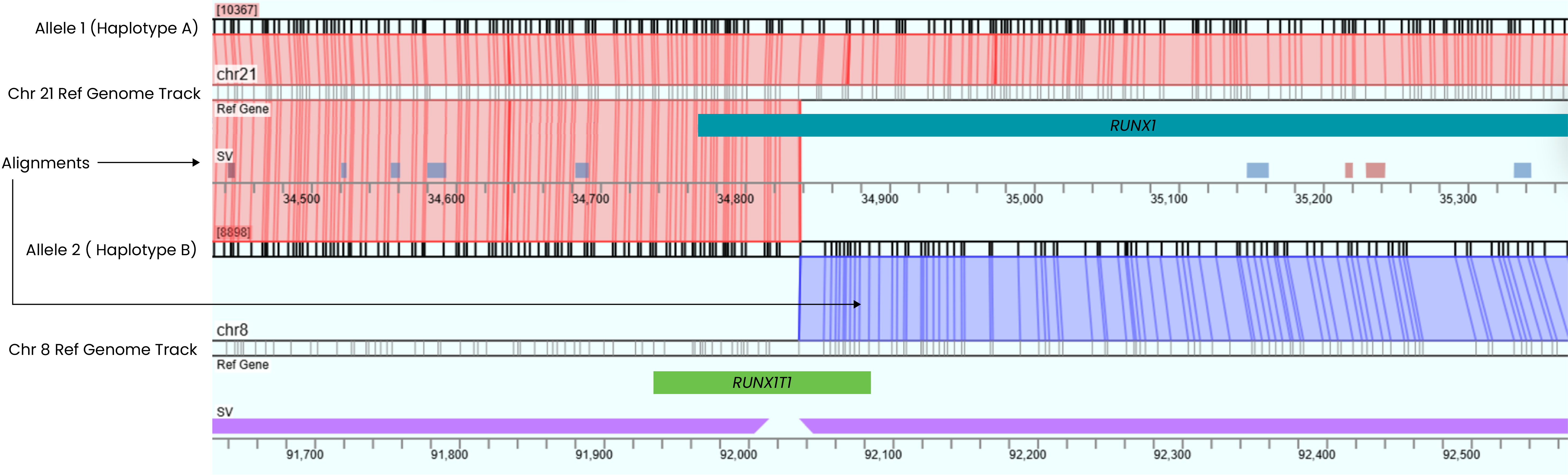 The RUNX1::RUNX1T1 fusion resulting from the t(8;21) translocation is a critical risk marker of acute myeloid leukemia (AML) and is sufficient for diagnosis of the disease.