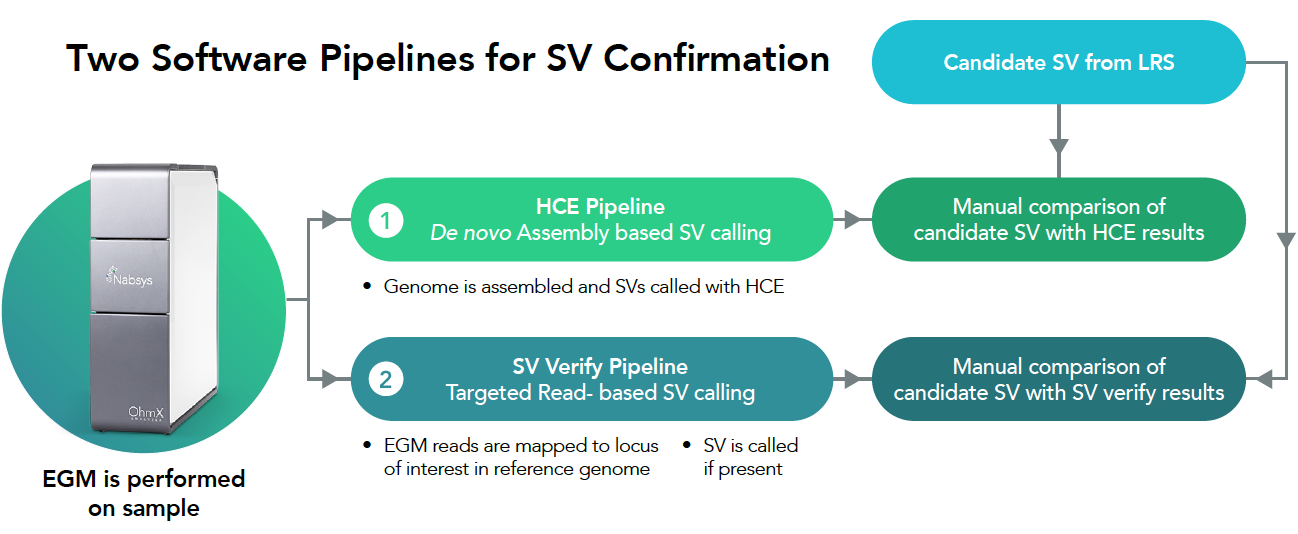 Two cloud-based software pipelines are available on Google Cloud to confirm or clarify structural variants (SVs) that require orthogonal validation. To evaluate a candidate SV, users can conduct EGM analysis on the OhmX Platform, then upload the resulting data to one or both pipelines for further analysis.