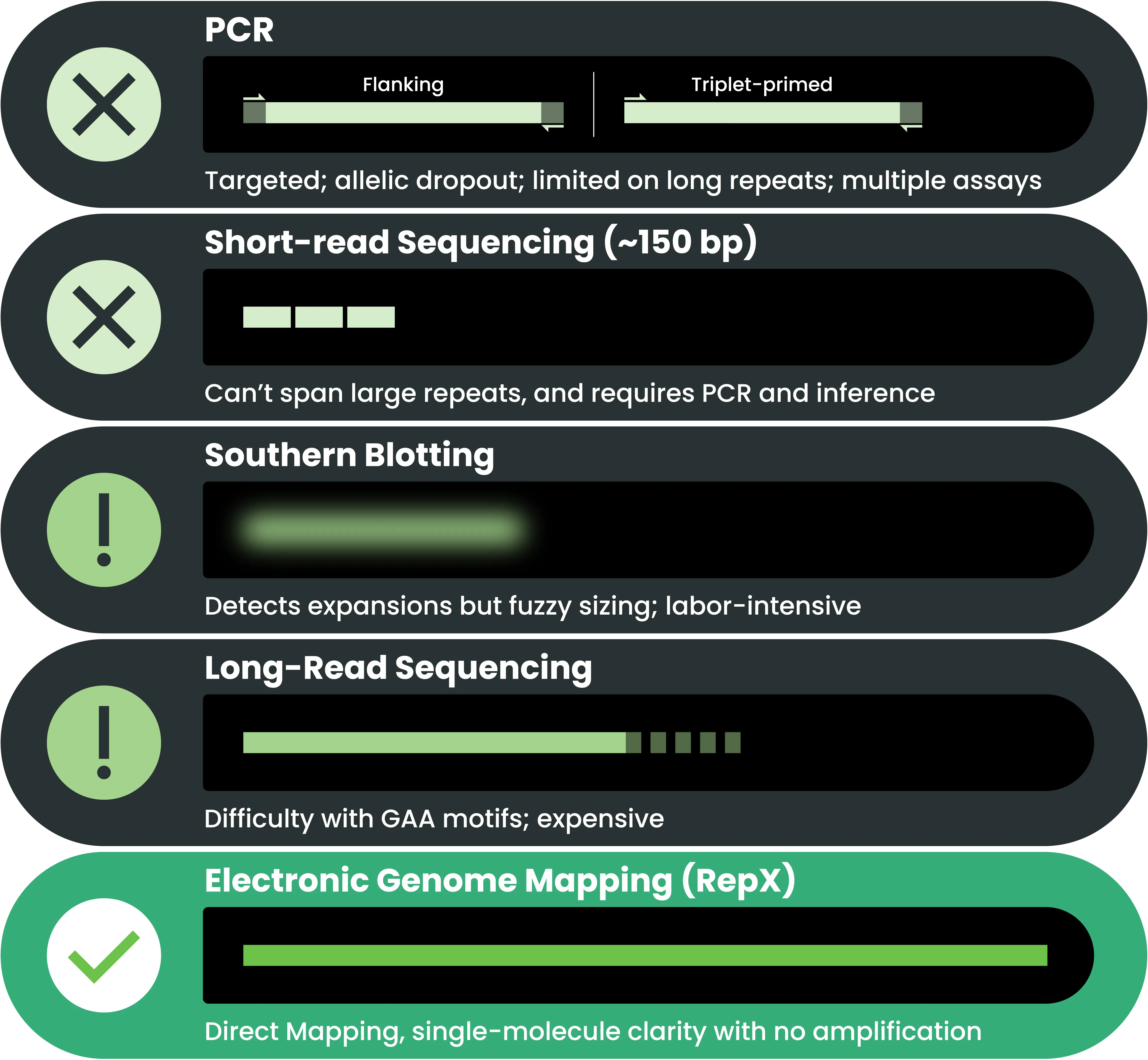 Repeat expansions drive more than 60 neurological and neuromuscular disorders, yet they remain among the most difficult genomic features to study.1,2 PCR fails on large alleles, while short-read sequencing cannot map across long repetitive tracts because it relies on short molecules and inference.2,3 Even long-read platforms struggle to span GC-rich expansions at scale, and southern blotting continues to be slow, imprecise, and labor-intensive.3