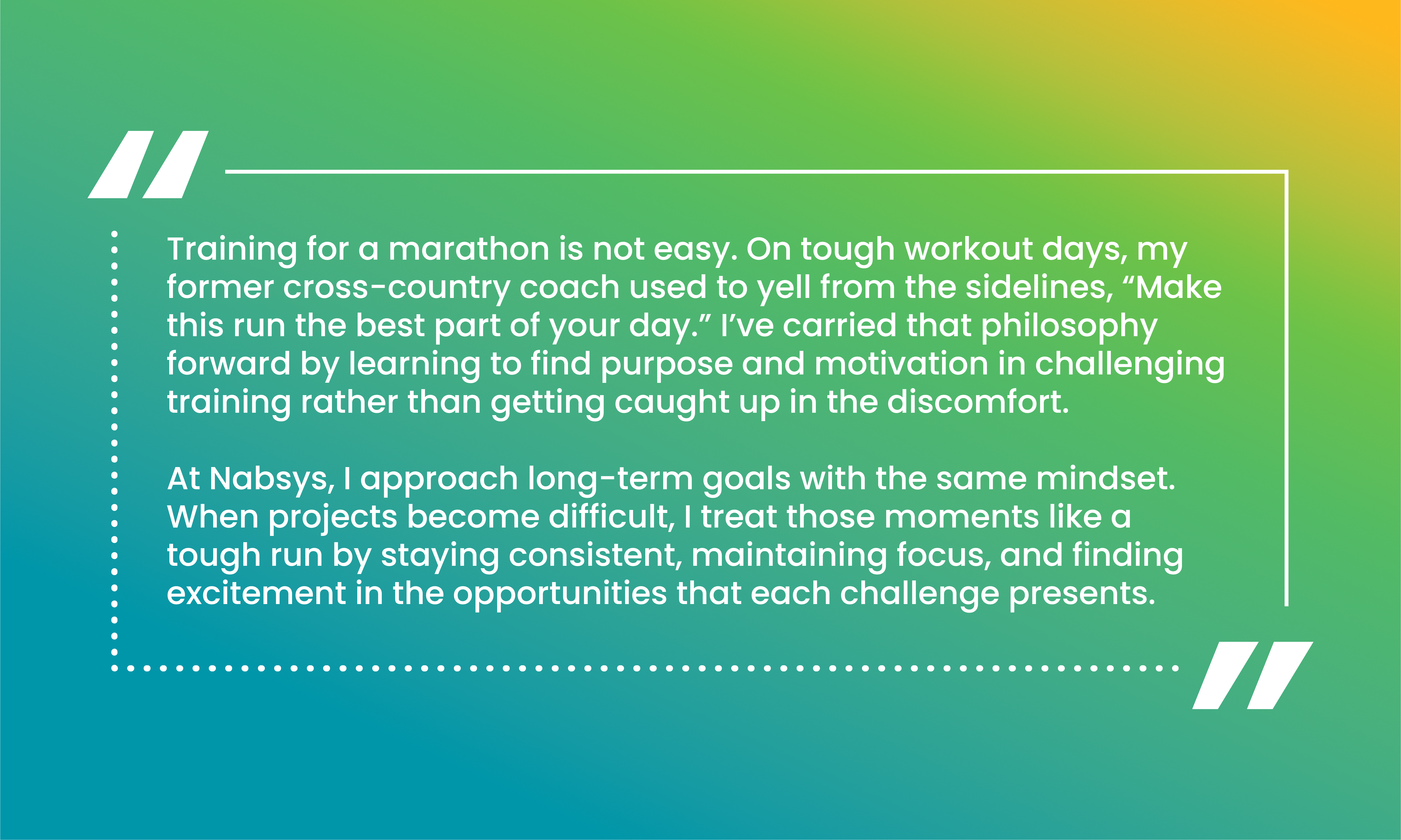 Her perspective reflects something we see across Nabsys. Progress often comes from consistent effort, thoughtful problem-solving, and a willingness to push a little further each day. Whether she is logging miles or refining detector performance, Kally brings the same focus and sense of purpose to both.